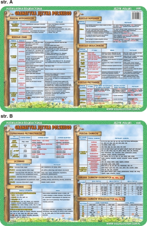 Laminowana i elastyczna podkładka na biurko, praktyczna pomoc w nauce, o wymiarach 40x30 cm, Podział wypowiedzeń, rodzaje dopełnień, stopniowanie przymiotników, podział zaimków