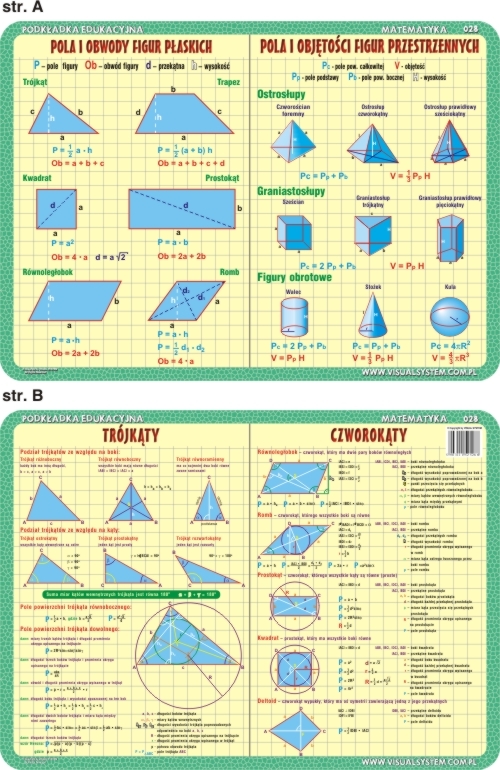 Dwustronna podkładka edukacyjna - prezentuje zagadnienia z zakresu: pola i obwody figur płaskich, pola i objętości figur przestrzennych, trójkąty, czworokąty. Format 40 x 30 cm. Usztywniona, ale jednocześnie elastyczna, dwustronnie foliowana. Wchodzi w skład zestawu 60 podkładek edukacyjnych zawierających kilkaset tematów pomocnych w utrwalaniu wiedzy, rozwijaniu zainteresowań, w nauce oraz zabawie.