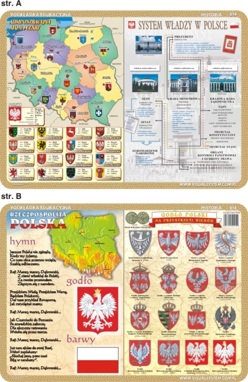 Laminowana i elastyczna podkładka na biurko, praktyczna pomoc w nauce, o wymiarach 40x30 cm, Polskie godło, barwy, hymn, godło Polski na przestrzeni wieków, administracyjna mapa Polski, system władzy w Polsce