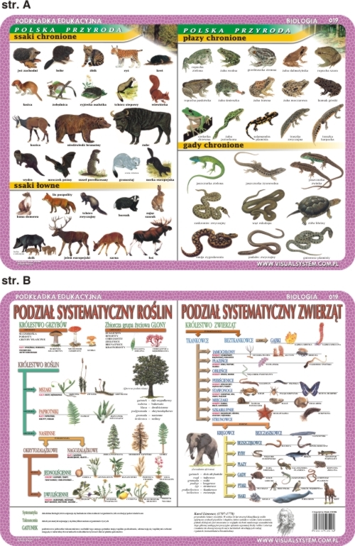 Laminowana i elastyczna podkładka na biurko, praktyczna pomoc w nauce, o wymiarach 40x30 cm, Ssaki i płazy chronione, podział systematyczny roślin i zwierząt