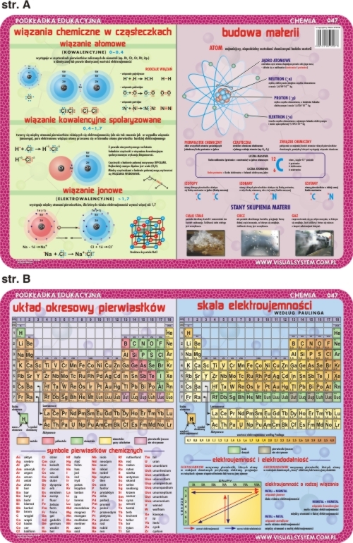 Laminowana i elastyczna podkładka na biurko, praktyczna pomoc w nauce, o wymiarach 40x30 cm, Układ okresowy pierwiastków, skala elektroujemności, budowa materii, wiązania chemiczne