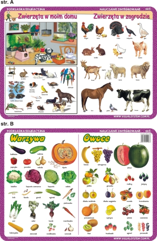 Laminowana, dwustronna podkładka edukacyjna o wymiarach 40x30 cm. Doskonała pomoc w nauce dla dzieci w wieku szkolno-przedszkolnym. Tematy na podkładce nr 003: warzywa, owoce, zwierzęta w zagrodzie, zwierzęta w moim domu.