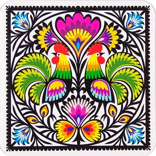 Folk podstawek korkowy przedstawiający tradycyjną wycinankę łowicką - dwa koguty: