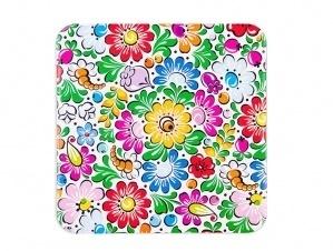FOLK podkładka korkowa pod kubek w opolskie wzory ludowe. Podkładkę pod kubek zdobią kolorowe kwiatki podobne do tych, jakie znajdują się w opolskich kroszonkach (kraszankach) czy znanej na całym świecie porcelanie opolskiej. Wzór na podkładce inspirowany jest tradycyjnym wzorem ludowym z regionu opolskiego. Elementem przewodnim opolskich wzorów są barwne kwiaty.