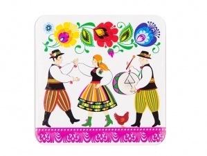 FOLK podkładka korkowa pod kubek WESELNICY I KURA prezentuje scenki ludowe z życia wsi łowickiej. Podkładkę pod kubek zdobią scenki przedstawiane na łowickich wycinankach zwane łowickimi kodrami. Wzór na podkładce inspirowany jest tradycyjnym wzorem ludowym z regionu łowickiego. Elementem przewodnim na łowickich wycinankach są koguty, pawie, motywy kwiatowe oraz scenki ludowe.