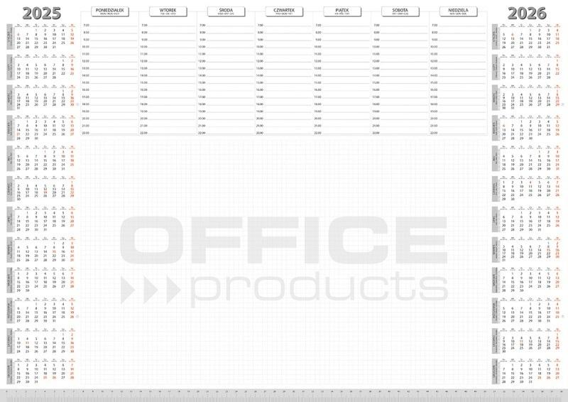 oryginalny projekt zgodny z zasadami organizacji czasu pracy: po lewej stronie kalendarz na 2025 rok, po prawej stronie kalendarz na 2026 rok, na czerwono oznaczone dni wolne, u góry rozkład tygodnia, godziny od 7.00 do 20.00, pod kalendarzem tygodniowym powierzchnia w kratkę przeznaczona na notatki