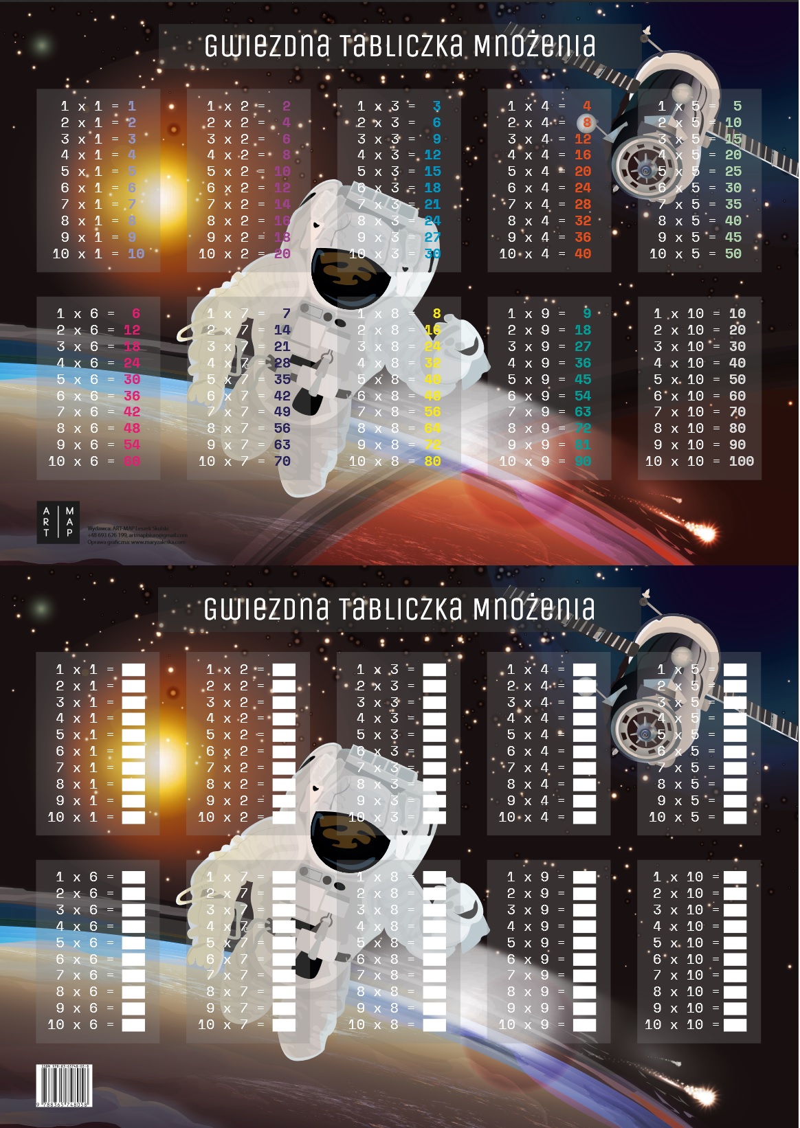 Plansza edukacyjna - gwiezdna tabliczka mnożenia. Plansza może służyć jako podkładka na biurko. Na jednej stronie tabliczka mnożenia z wynikami. Na drugiej działania mnożenia 1-10 z pozostawionym pustym miejscem na wpisanie wyniku. To doskonały pomysł na ćwiczenie mnożenia. Na tablicy można pisać pisakiem suchościeralnym. Plansza foliowana dwustronnie.