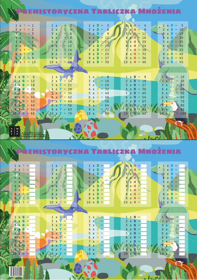 Plansza edukacyjna - tabliczka mnożenia - prehistoria. Plansza może służyć jako podkładka na biurko. Na jednej stronie tabliczka mnożenia z wynikami. Na drugiej działania mnożenia 1-10 z pozostawionym pustym miejscem na wpisanie wyniku. To doskonały pomysł na ćwiczenie mnożenia. Na tablicy można pisać pisakiem suchościeralnym. Plansza foliowana dwustronnie.