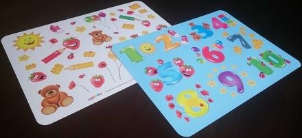 Podkładka na stół lub biurko, wymiar A3 (300x420 mm), papierowa i zafoliowana - dzięki czemu jest odporna na zabrudzenia i wilgoć. Z jednej strony kolorowe cyferki wraz z wesołymi ilustracjami które służą do nauki liczenia, z drugiej barwne i wesołe ilustracje. Doskonale ozdabia stół, biurko lub inne dziecięce stanowisko pracy lub zabawy. Może chronić blat przed zabrudzeniem podczas jedzenia, rysowania, malowania czy zabawy plasteliną.