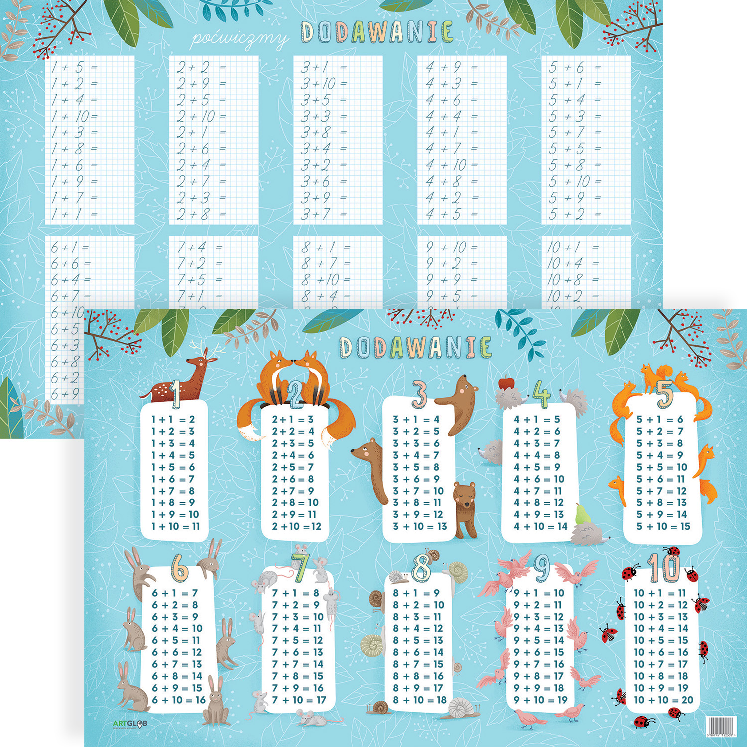 Podkładka prezentuje zbiór działań matematycznych, doskonalących umiejętność dodawania od 1 do 20. Drugą jej stronę pokrywają analogiczne ćwiczenia.