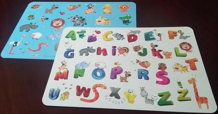 Podkładka na stół lub biurko, wymiar A3 (300x420 mm), papierowa i zafoliowana - dzięki czemu jest odporna na zabrudzenia i wilgoć. Z jednej strony kolorowe literki wraz z wesołymi zwierzątkami które zaczynają swoją nazwę na daną literkę, z drugiej barwne i wesołe ilustracje zwierząt. Doskonale ozdabia stół, biurko lub inne dziecięce stanowisko pracy lub zabawy. Może chronić blat przed zabrudzeniem podczas jedzenia, rysowania, malowania czy zabawy plasteliną.