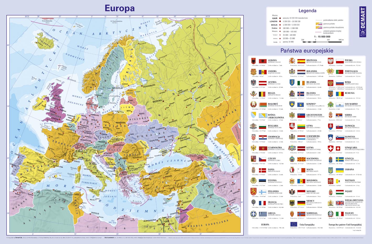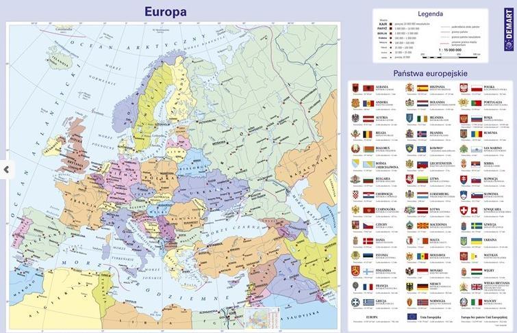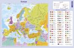 Mapie z podziałem politycznym Europy w skali 1 : 15 000 000 towarzyszą symbole wszystkich europejskich państw (flagi i herby) oraz informacje o ich powierzchni i liczbie ludności. Podkładka z taką treścią pomoże w opanowaniu nazw krajów i ich stolic, rozmieszczenia na kontynencie względem innych państw i dostępności lub jej braku do morza czy oceanu, zapamiętaniu sąsiedztwa i relacji wielkości powierzchni poszczególnych krajów.