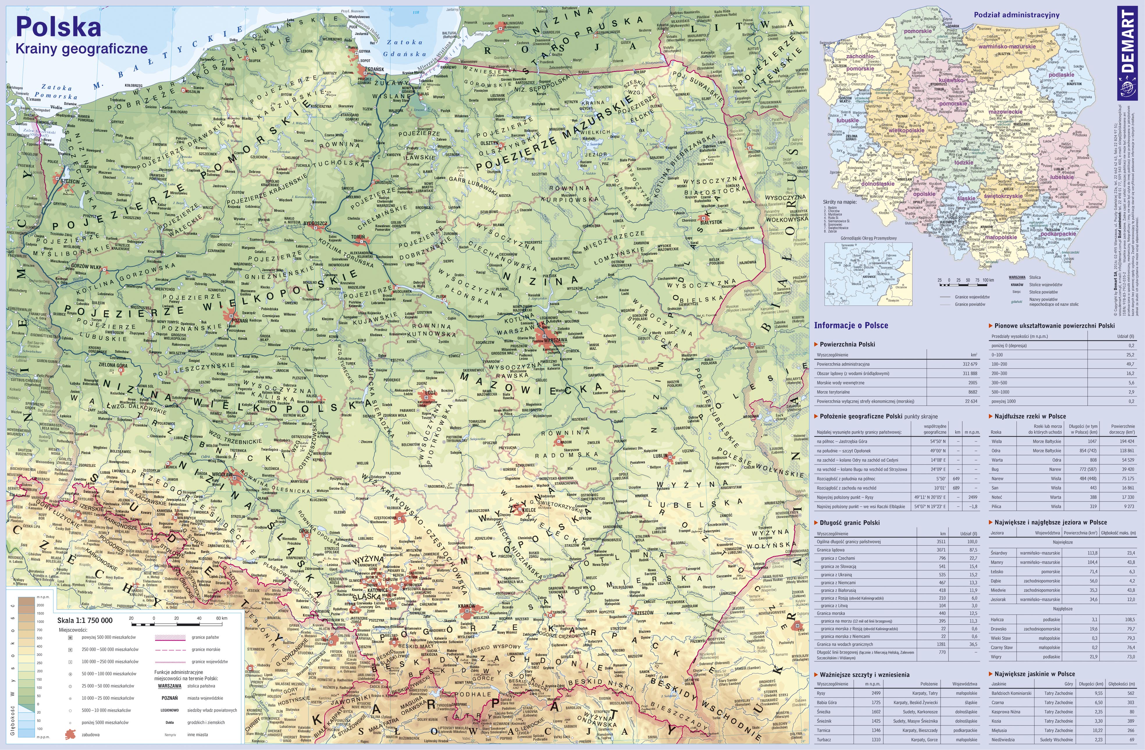 Głównym elementem podkładki jest mapa fizyczna Polski w skali 1 : 1 750 000. Na jej podstawie można poznać główne krainy geograficzne, rzeki, jeziora, szczyty oraz prześledzić przebieg granic lądowych i morskich naszego kraju. Elementy uzupełniające stanowią mapa podziału administracyjnego oraz informacje o polskich rekordach takich jak: najwyższe szczyty w poszczególnych pasmach, najdłuższe rzeki, największe i najgłębsze jeziora itp. To znakomita pomoc w nauce geografii naszego kraju!