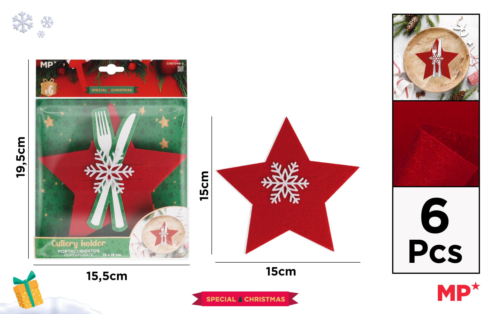Kształt: gwiazdka (15x15cm). Wykonane z filcu o grubości 2 mm, starannie wyciętego w kształty choinki i gwiazdy. Lekki, elastyczny i sprężysty materiał, który chroni naczynia przed zarysowaniami i poślizgiem. Wielokrotnego użytku, trwały i odporny na zagniecenia. Każdy zestaw zawiera 6 sztuk + parę kartonowych sztućców, wszystkie zapakowane w torbę OPP.