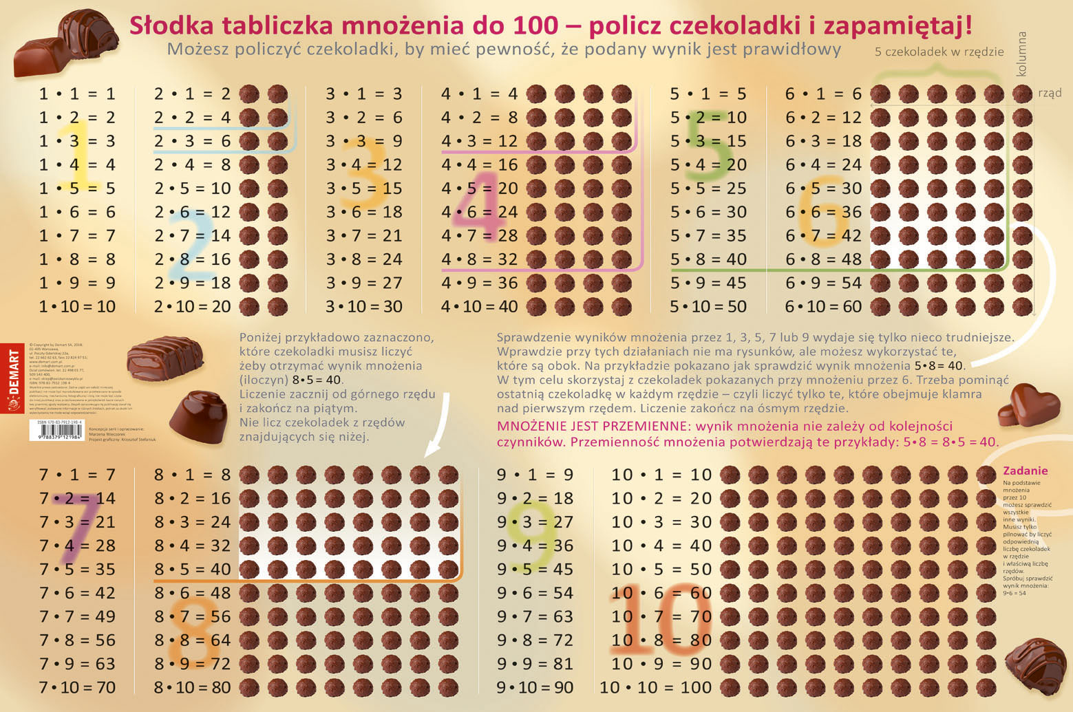 Słodka plansza z czekoladkami pozwala na policzenie każdego wyniku działania mnożenia w zakresie 100. Pokazuje praktyczną przydatność mnożenia i jego stosowania w życiu oraz potwierdza, że działanie jest przemienne.