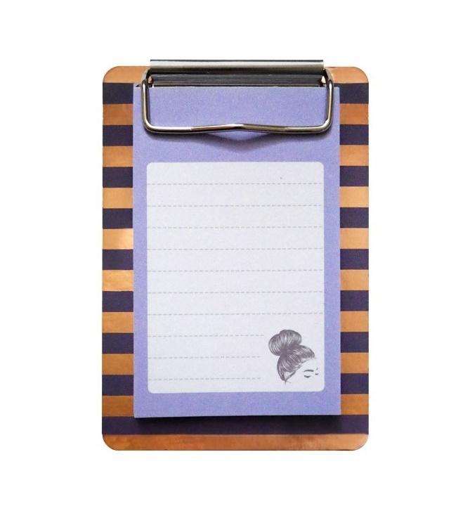 Podkładka magnetyczna w fioletowo złote paski z motywem dziewczyny + notes 50 kartkowy.