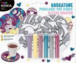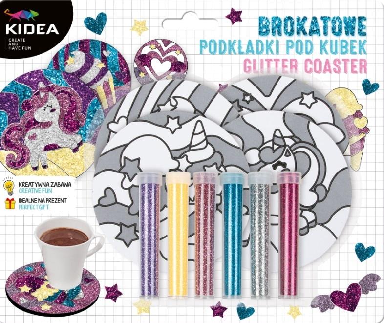 Zestaw kreatywny brokatowe podkładki Bajkowy Świat od Kidea. W zestawie znajdują się 4 podkładki pod kubek z różnymi, bajkowymi wzorami: babeczką, lodami, uskrzydlonym sercem i jednorożcem, oraz 6 kolorów brokatów: dwa odcienie różu, fioletowy, niebieski, złoty i srebrny. Wystarczy zdjąć ochronną naklejkę z wybranego fragmentu podkładki i obsypać ją brokatem, który natychmiast przyklei się do znajdującego się pod naklejką kleju. Zestaw kreatywny pozwala na dowolną zabawę kolorami, rozwijając przy tym wyobraźnię i kreatywność dziecka. Własnoręcznie wykonane brokatowe podkładki będą pięknie wyglądać na stole pod kubkiem z gorącym lub zimnym napojem. Zestaw sprawdzi się również jako wyjątkowy prezent na każdą okazję.