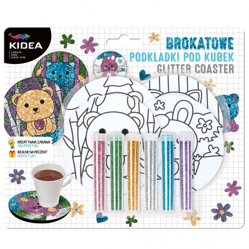 Zestaw kreatywny brokatowe podkładki Zwierzaki od Kidea. W zestawie znajdują się 4 podkładki pod kubek z różnymi zwierzakami: pandą, króliczkiem, misiem i kotkiem, oraz 6 kolorów brokatów: zielony, różowy, fioletowy, niebieski, złoty i srebrny. Wystarczy zdjąć ochronną naklejkę z wybranego fragmentu podkładki i obsypać ją brokatem, który natychmiast przyklei się do znajdującego się pod naklejką kleju. Zestaw kreatywny pozwala na dowolną zabawę kolorami, rozwijając przy tym wyobraźnię i kreatywność dziecka. Własnoręcznie wykonane brokatowe podkładki będą pięknie wyglądać na stole pod kubkiem z gorącym lub zimnym napojem. Zestaw sprawdzi się również jako wyjątkowy prezent na każdą okazję.