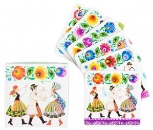 Zapakowane w ozdobne pudełko podkładki pod kubek WESELE ŁOWICKIE prezentuje scenki ludowe z życia wsi łowickiej. Podkładkę pod kubek zdobią scenki przedstawiane na łowickich wycinankach zwane łowickimi kodrami. Wzór na podkładce inspirowany jest tradycyjnym wzorem ludowym z regionu łowickiego. Elementem przewodnim na łowickich wycinankach są koguty, pawie, motywy kwiatowe oraz scenki ludowe.