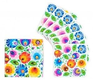 Zapakowane w ozdobne pudełko podkładki pod kubek w łowickie wzory ludowe. Podkładkę pod kubek zdobią barwne kwiaty z łowickiej wycinanki na białym tle. Wzór na podkładce inspirowany jest tradycyjnym wzorem ludowym z regionu łowickiego. Elementem przewodnim na łowickich wycinankach są koguty, pawie oraz motywy kwiatowe.