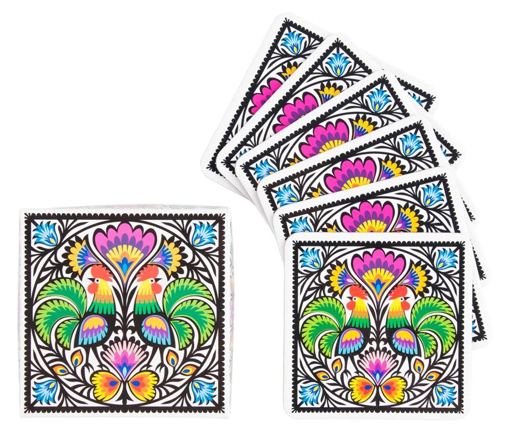 podstawowymi elementami wycinanek łowickich są koguty, pawie oraz motywy kwiatowe,podkładka folk wykonana jest z korka i tektury oraz pokryta folią błyszczącą,doskonały upominek w stylu folk dla każdego,zestaw zawiera 6 szt. podkładek zapakowanych w ozdobne pudełko