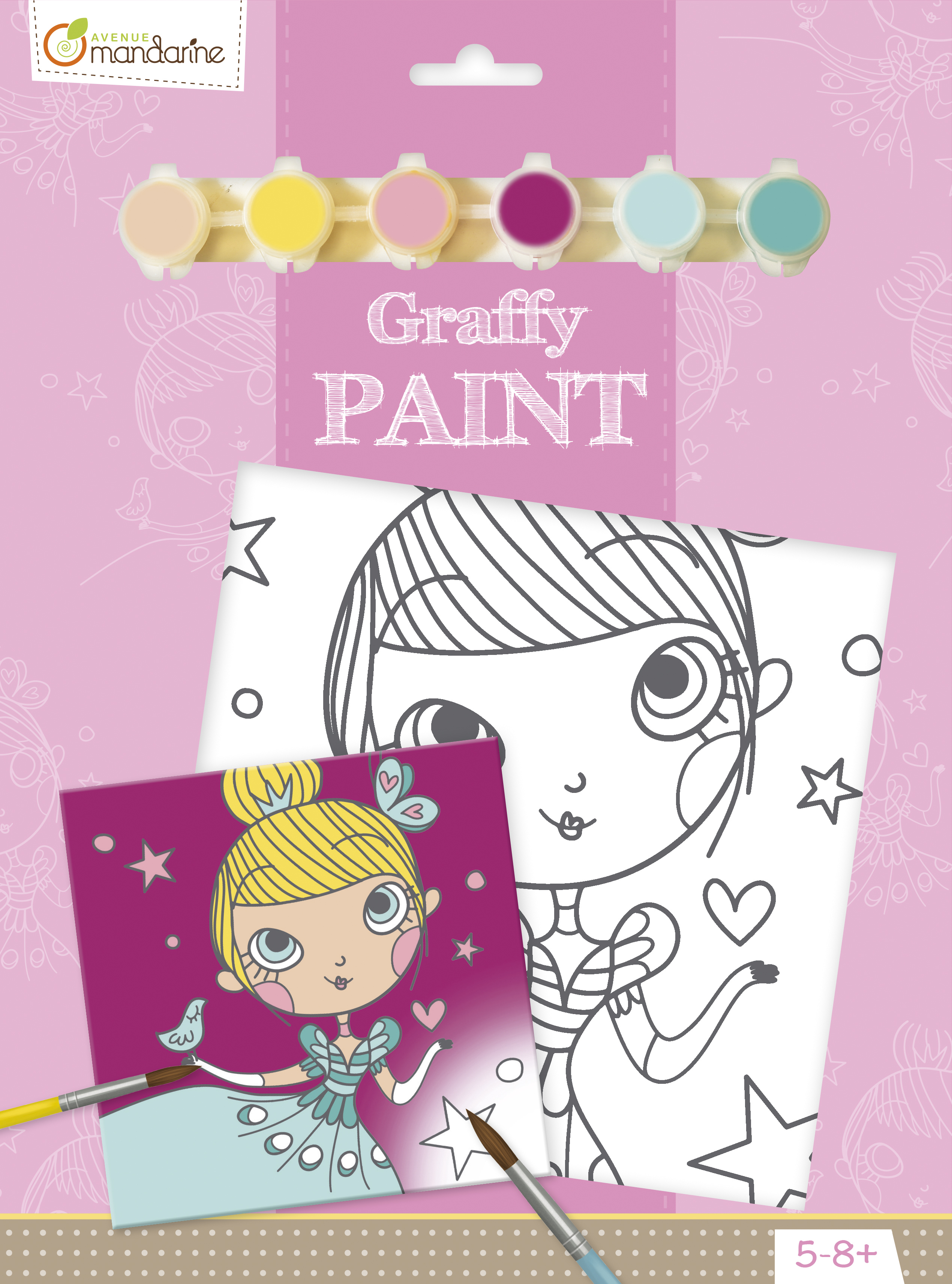 Zestaw zawiera: podobrazie z nadrukiem 20x20cm + 6 plastikowych pojemniczków z farbami + pędzel