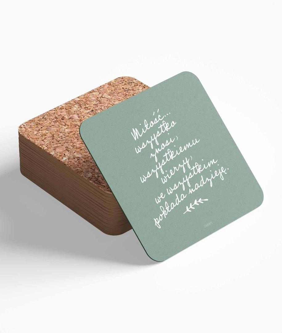 To werset, który inspiruje, buduje i zachęca. Podkładka wykonana jest z naturalnego korka, ma wymiary 10 cm x 10 cm i świetnie sprawdzi się pod kubek w domu i biurze.
