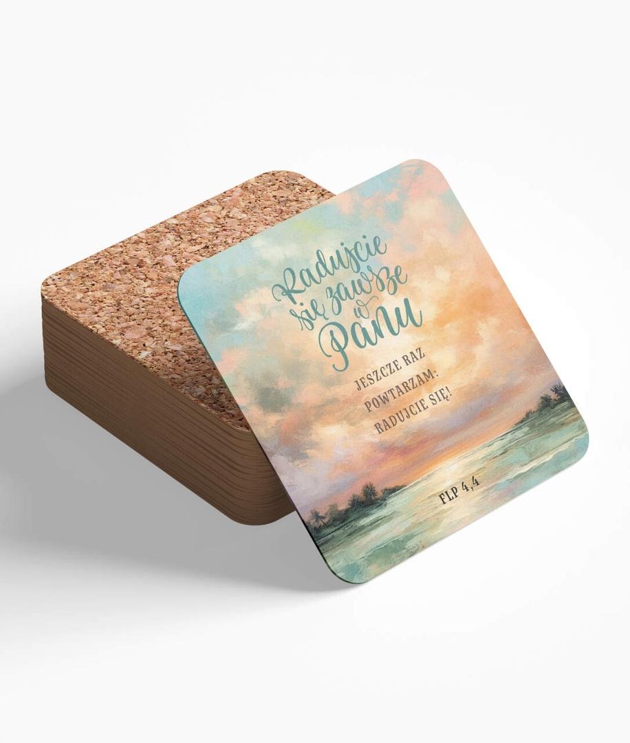 Podkładka korkowa pod kubek z cytatem biblijnym - "Radujcie się zawsze w Panu..." (Flp 4,4)