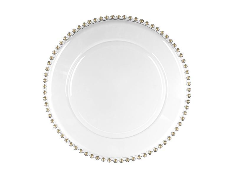 Podtalerz z perłami wykonany z transparentnego plastiku, średnica ok. 32 cm i głębokość 3 cm.