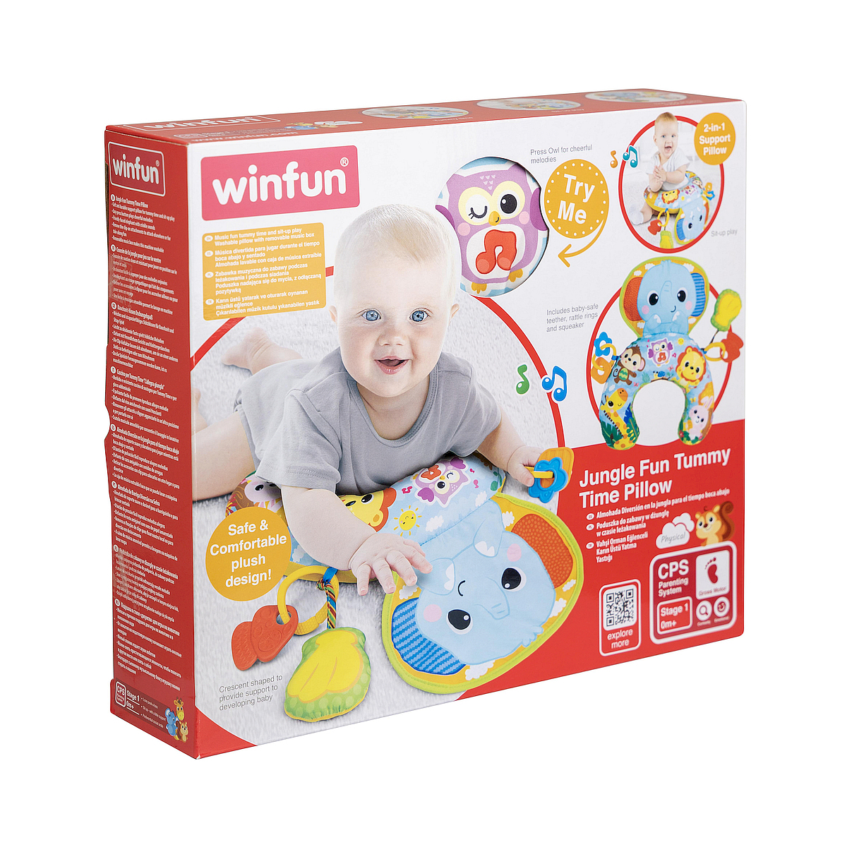 PODUSZKA DŻUNGLA 1/12 funkcyjna poduszka dla malucha z muzyką i odczepianymi grzechotkami, które można wykorzystać przy wózku, nosidełku, foteliku samochodowym oraz do samodzielnej zabawy. Poduszka sprawdzi się od momentu narodzin . Wygodna do zabawy na brzuszku,a gdy dziecko podrośnie- doskonała podpora podczas siedzenia. Wykonana z miłego w dotyku materiału, można prać w pralce (po wyjęciu baterii) wesoła kolorystyka, zabawne zwierzątka. Naciśnij sowę z nutka a będą rozbrzmiewać przyjemne dla małego ucha melodyjki. Słoń-szeleścik to dodatkowa atrakcja dla małego odkrywcy podczas poznawania otoczenia. Poducha pozytywnie wpłynie na rozwój dziecka już od momentu narodzin, pobudzając zmysły i zwiększając umiejętności motoryczne. - 5 melodyjek - słoń szeleścik - 3 odczepiane gryzaki w różnych kształtach o różnorodnych teksturach - piszcząca łapka z tasiemką - 2 zaczepy do do łatwego mocowania kolorowych kształtów