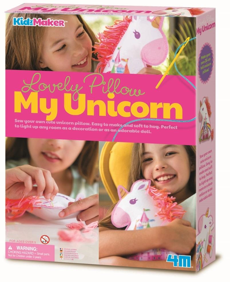 Uszyj swoją własną uroczą poduszkę w kształcie jednorożca. Łatwy w wykonaniu i miękki w przytulaniu. Ręcznie wykonana poduszka będzie ozdobą każdego pomieszczenia i ulubioną maskotką każdej dziewczynki. Zestaw zawiera 2 wycięte kształty filcu, 1 szpulkę nici do haftu, 2 szpule przędzy, 2 plastikowe igły, wypełnienie i szczegółową instrukcję. Poduszka jednorożca ma około 25 cm wysokości. Wiek: 5+.