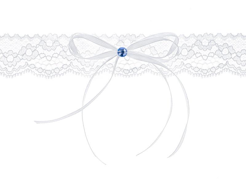 Podwiązka koronkowa w kolorze białym z satynową tasiemką i niebieskim oczkiem, szerokość 3,5 centymetra.