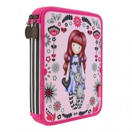 Podwójny piórnik z wizerunkiem dziewczynki Gorjuss w odcieniach błękitu i pudrowego różu. Pierwsza komora zawiera 2 ołówki, komplet 3 długopisów i 18 kredek, gumkę, oraz temperówkę. Druga komora wyposażona została w komplet 18 flamastrów, linijkę, ekierkę i kątomierz.