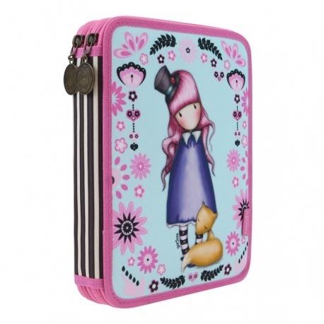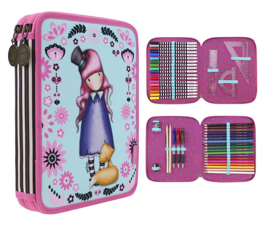 Podwójny piórnik z wizerunkiem dziewczynki Gorjuss w odcieniach błękitu i pudrowego różu. Pierwsza komora zawiera 2 ołówki, komplet 3 długopisów i 18 kredek, gumkę, oraz temperówkę. Druga komora wyposażona została w komplet 18 flamastrów, linijkę, ekierkę i kątomierz.