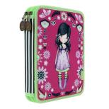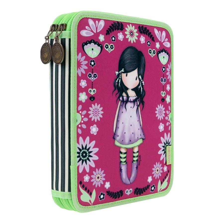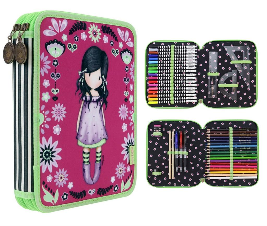 Podwójny Piórnik z Wyposażeniem - Gorjuss - You Brought Me Love. Podwójny piórnik z wizerunkiem dziewczynki Gorjuss, w odcieniach magenty, bzu i limonki. Pierwsza komora zawiera 2 ołówki, komplet 3 długopisów i 18 kredek, gumkę, oraz temperówkę. Druga komora wyposażona została w komplet18 flamastrów, linijkę, ekierkę i kątomierz. Ozdobiony medalionami w stylu antycznego mosiądzu. Każdy element wyposażenia posiada logo Santoro. Zawiera wszystko to, co potrzebne do szkoły. Wykonany ze szczególną dbałością. Wewnątrz posiada ciekawy wzór. Wspaniały na prezent.