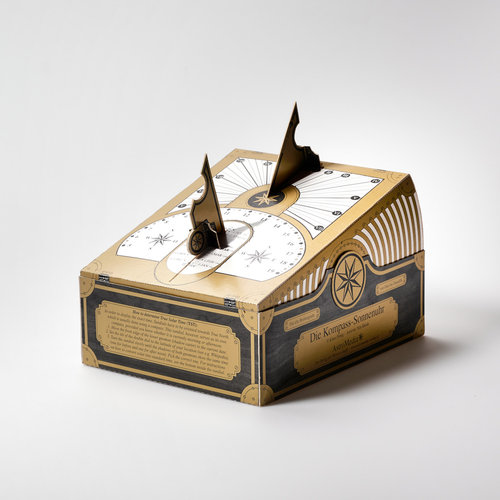 Zestaw do budowy kartonowego modelu podwójnego zegara słonecznego wzorowanego na modelach z XVIII wieku. Jego tarcze wskazują czas według dwóch różnych metod, dzięki czemu można odczytać zarówno prawdziwy czas lokalny (czas słoneczny) jak i czas urzędowy, a nawet określić kierunki świata. Możliwość dostosowania do wszystkich lokalizacji między Oslo i Kairem. Wymiary po złożeniu: 17 x 13,5 x 13,5 cm Zestaw zawiera: 4 arkusze lakierowanego kartonu zawierające elementy do budowy zegara Uwaga: elementy wymagają wycinania (nie są wstępnie przycięte) polskojęzyczna instrukcja