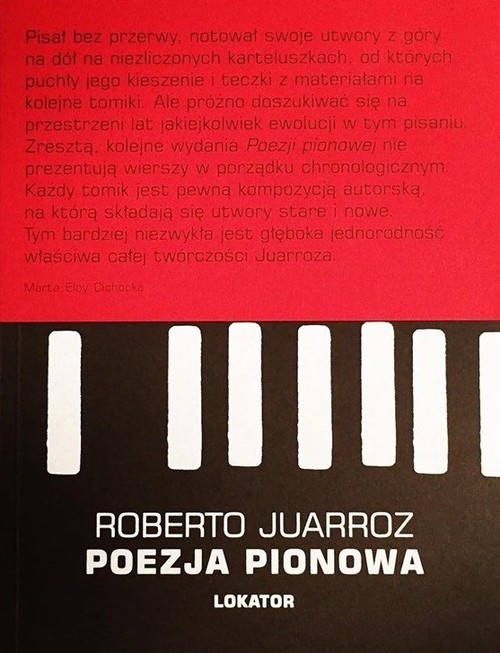 „Najlepsze, co poeta może powiedzieć, jest w jego poezji.” Roberto Juarroz tworzył poezję „pionową”, po prostu. Pisał bez przerwy, notował swoje utwory z góry na dół na niezliczonych karteluszkach, od których puchły jego kieszenie i teczki z materiałami na kolejne tomiki. Ale próżno doszukiwać się na przestrzeni lat jakiejkolwiek ewolucji w tym pisaniu. Zresztą, kolejne wydania Poezji pionowej nie prezentują wierszy w porządku chronologicznym, zgodnie z latami powstawania: przeciwnie, każdy tomik jest pewną kompozycją autorską, na którą składają się utwory stare i nowe. Tym bardziej niezwykła jest głęboka jednorodność właściwa całej twórczości Juarroza. Do rąk czytelników polskich trafia tom POEZJI PIONOWYCH w wyborze i w tłumaczeniu Marty Eloy Cichockiej. Ten subiektywny wybór obejmuje utwory ze wszystkich tomików Poezji pionowej z zachowaniem ich oryginalnej numeracji. […] Już dawno nie czytałem wierszy, które by mnie do tego stopnia zmęczyły i zachwyciły, co Pańskie, i tak to Panu mówię w biegu i już nie czytając po raz drugi, bo na koniec człowiek głupieje i zaczyna się bać tylu wielkich słów. Ale czuję, że mi Pan uwierzy i że już jesteśmy przyjaciółmi. Julio Cortázar Roberto Juarroz – Argentyńczyk, z wykształcenia bibliotekarz, z zamiłowania – myśliciel, z głębokiej wewnętrznej potrzeby – poeta. Człowiek niezwykle świadomy i bardzo konsekwentny w swoich życiowych wyborach, zdecydowany wróg polityki i… literatury, przeciwnik angażowania się poetów w sprawy nie związane z poezją. Pozostawił po sobie kilkanaście tomików „poezji pionowej”, kilkaset „okruchów pionowych”, trzy wypowiedzi programowe – oraz nadzieję na uwolnienie poezji z bagażu gadulstwa i ciężaru ornamentyki.