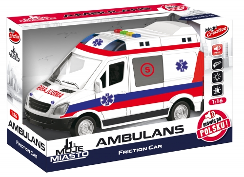Pozwól swojemu dziecku poczuć się jak prawdziwy kierowca karetki, która pędzi na sygnale do chorego człowieka. To ogromne wyzwanie dla każdego zapalonego, małego medyka! Samochód Ambulans z serii Moje Miasto MEGA CREATIVE posiada efekty dźwiękowe oraz świetlne: sygnał karetki, polskie odgłosy, światła ''koguta''. Dodatkowym atutem jest również funkcja pull back - po pchnięciu pojazdu do przodu, kontynuuje on jazdę samodzielnie. Samochód wykonany z plastiku, w skali 1:14. Przeznaczony dla dzieci w wieku: 3+. Wymaga zasilania 2 bateriami AA 1,5V - załączonymi do zestawu. Wymiary opakowania(dł. x wys. x gł.) [cm]: 32x19x14.