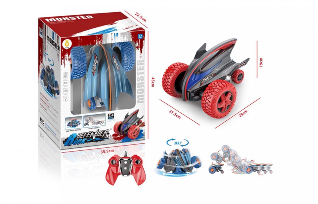 Funkcje: FF, światła, staje i obraca się o 360 stopni, koziołkuje. W zestawie: ładowarka, zestaw bateryjny. Długość pojazdu: 30cm.