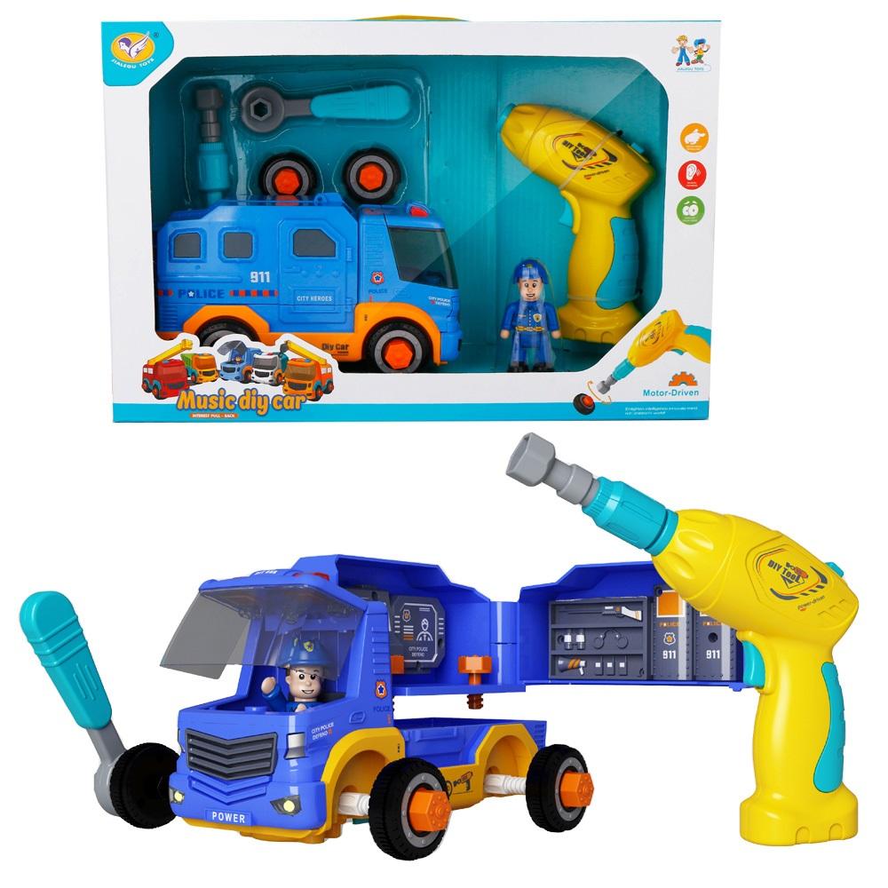 Policja do skręcania z wiertarką. W zestawie również klucz do montowania kół oraz kierowca. Przednia szyba auta podnoszona, dzięki czemu można wyjąć kierowcę. Samochód z dźwiękami, wymaga baterii - 2xAAA (niedołączone). Wiertarka wymaga baterii - 2xAA (niedołączone).