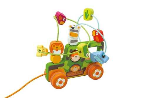 Autko marki Sevi na kółkach posiada umieszczone na swoim dachu metalowe pętle, po których dzieci mogą przesuwać drewniane elementy w postaci wesołych, egzotycznych zwierzątek. Pojazd do ciągnięcia za sznurek