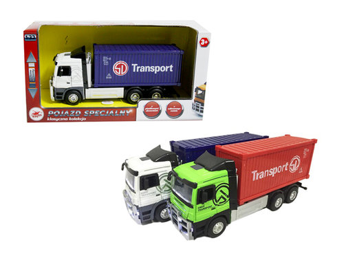 PLAYME - Ciężarówka z kontenerem z napędem frykcyjnym i efektami. Funkcje: napęd frykcja, światło, dźwięki, otwierane drzwiczki. Skala 1:32; 2 kolory. Zabawka przeznaczona dla dzieci powyżej 36 miesięcy.