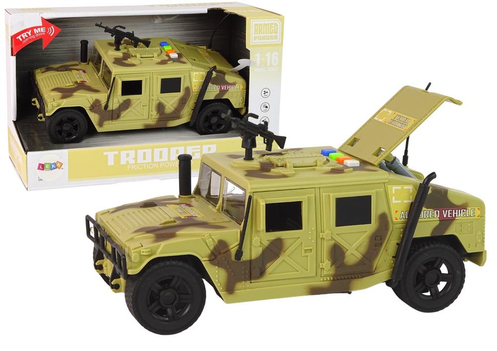 Samochód Pojazd Wojskowy Napęd Frykcyjny Jasne Moro Twoje dziecko interesuje się tematyką wojskową, a zwłaszcza pojazdami ? To właśnie ten czołg rozbudzi w nim pasję i pozwoli poznać tajniki wojska. Maluch doda nowy element do swojej kolekcji. Niebanalna niespodzianka dla wszystkich fanów wojska i motywów militarnych. Proponowany zestaw został stworzony specjalnie dla małych żołnierzy, którzy pasjonują się tym bohaterskim, acz niebezpiecznym zawodem. Pojazd ma kolorystykę wojenną, szeroki korpus, pistolet na dachu, który imituje jazdę prawdziwego auta. Na dachu posiada 4 przyciski odpowiadające za różne odgłosy dźwiękowe. Odgłos klaksonu, strzałów, cofania i odpalania auta. Wszystkiemu towarzyszą przednie światła. Każdy szczegół jest identyczny, jak w prawdziwym pojeździe. Wymiary auto: 23 cm x 12 cm x 13 cm Wymiary opakowania: 29 cm x 18 cm x 13 cm Przeznaczony dla dzieci powyżej 3 roku życia. Zabawka posiada certyfikat CE i jest zgodna z normą EN 71. Zasilana trzema bateriami AG13, w zestawie. Zapakowana jest w kartonik, dzięki czemu nadaje się na prezent.
