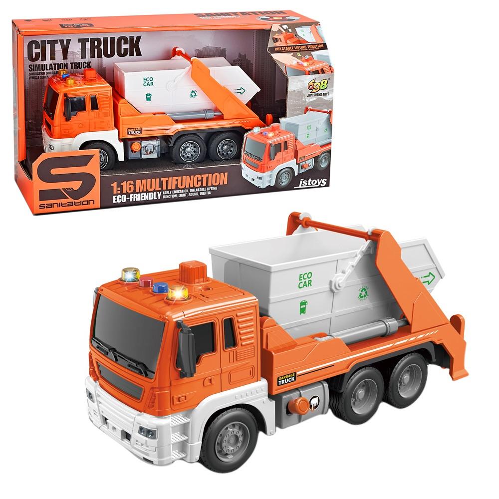 Pojazd z kontenerem na śmieci z ruchomymi elementami. Efekty dźwiękowe i świetlne. Skala - 1:16 Wymagane baterie: 3xAG13 (dołączone)
