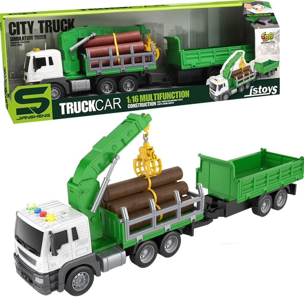 Ciężarówka z dwoma naczepami to niezastąpiona zabawka dla małych miłośników lasu i budowy.