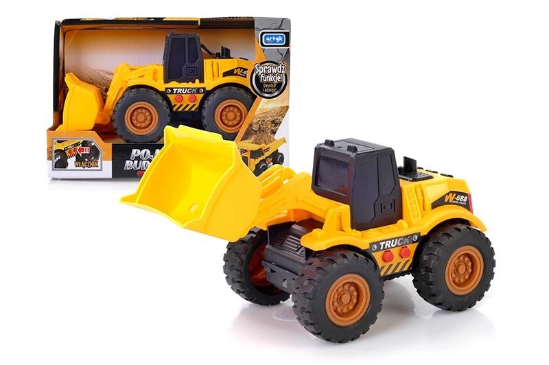 Pojazdy Budowlane Spychacz. Funkcje: dźwięk pracy silnika, dźwięk klaksonu, światła ostrzegawcze, ruchoma łyżka.