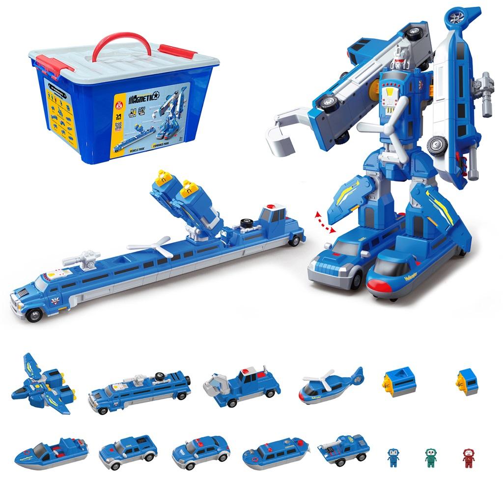Zestaw pojazdów magnetycznych umożliwiających zbudowanie jednego dużego pojazdu.