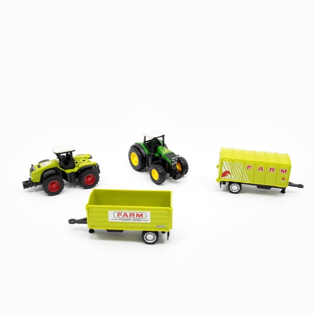 - W zestawie znajdują się 2x metalowe pojazdy rolnicze - 2x naczepy - Pojazdy poruszają się trybem "pull back". Mianowicie, trzeba naciągnąć traktor i puścić - Produkt nie wymaga użycia baterii