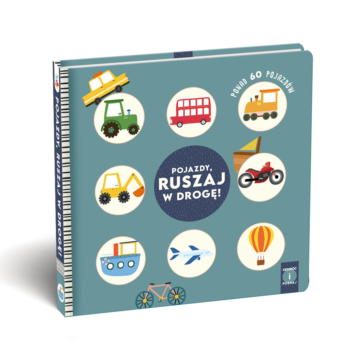 Książka Pojazdy, ruszaj w drogę pozwoli dzieciom nauczyć się ponad 60 słów oraz wyrazów dźwiękonaśladowczych związanych z pojazdami. Najmłodsi czytelnicy odkryją, które z nich poruszają się po wodzie, na lądzie i w powietrzu, pracują na budowie, w mieście czy na wsi oraz pomagają ludziom w codziennym życiu. Każda strona to niezliczone możliwości zabawy w rozpoznawanie pojazdów oraz ich odgłosów, naukę kolorów, ocenę rozmiarów oraz ćwiczenie liczenia.