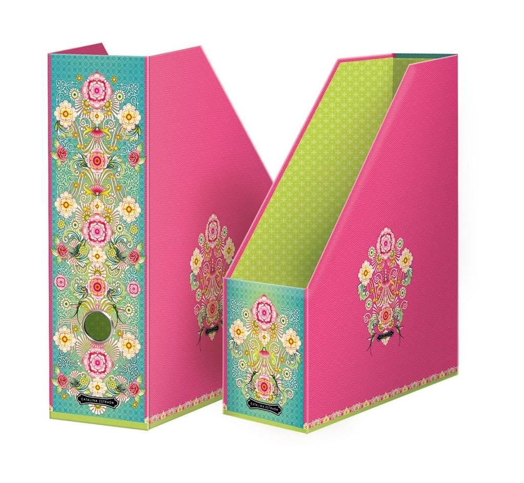 Pojemnik na dokumenty wykonany z tektury z ozdobnym kolorowym nadrukiem. Idealne rozwiązanie do przechowywania i przenoszenia wszelkiego typu dokumentów, czasopism, notatek i rysunków w formacie A4. Okrągłe wycięcie na palec pozwalające na łatwe wysuwanie pojemnika. Pojemnik na dokumenty jest niezbędny w domu lub biurze. Format A4 o ściętych bokach.